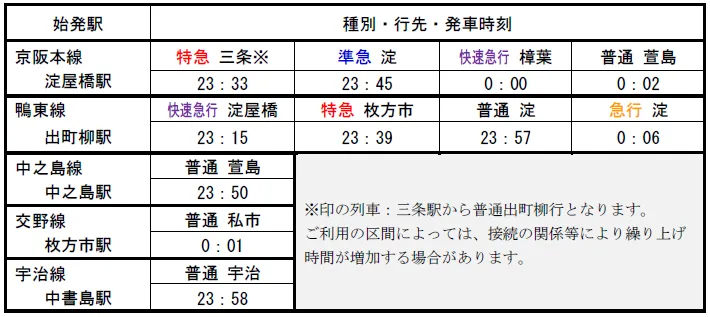 なお、現在、京阪線において実施している最終列車運転時刻の繰り上げについては、新型コロナウイルス感染症拡大によるご利用状況に鑑みて、9月24日(金)まで継続して行います。