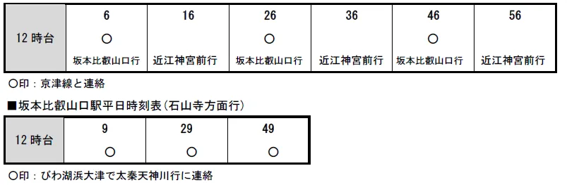 石山坂本線において、昼間時間帯の一部列車の運転区間を見直します。また、大津線全線において、全時間帯で発着時間の調整を実施します。なお、大津線においては始発、最終列車に大きな変更はありません。