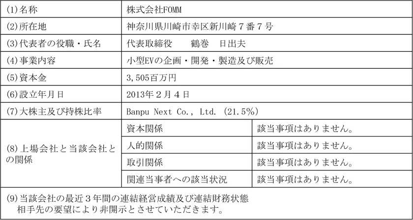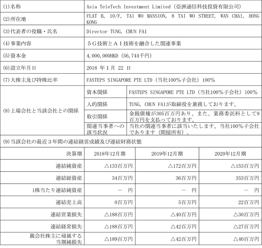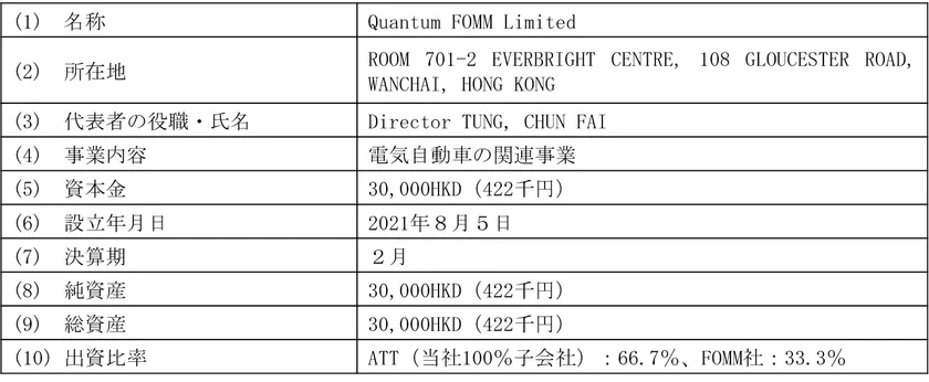 本資本・業務提携では、当社グループがFOMM社に対して出資する予定ですが、FOMM社との協議等の結果、それに加えて中国におけるEV(電気自動車)の生産体制及び販売体制の構築・整備をより迅速に行うため、当社グループとFOMM社との間で、香港に合弁会社を設立(商号:Quantum FOMM Limited、以下「新会社」という。)することで合意し、新会社を中心として、中国国内での、EV生産体制及び販売体制の構築・整備を行っていくことといたしました。新会社への出資は、当社グループとしては、当社の100%子会社であるAsia TeleTech Investment Limited(以下「ATT」という。)から直接行う予定であり、FOMM社側からは、FOMM社本体から行う予定です。