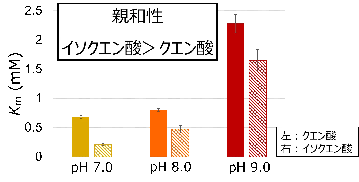 その結果、いずれのpHにおいても、クエン酸よりイソクエン酸に対するKm値の方が低く、イソクエン酸に対する親和性の方が高くなりました。Km値を比較すると、イソクエン酸からクエン酸の反応が強いことが分かりました。