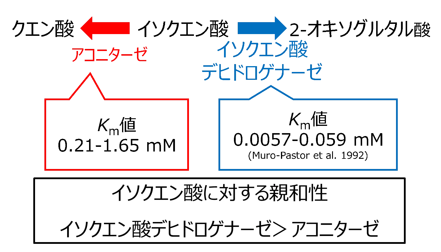 その結果、イソクエン酸デヒドロゲナーゼのイソクエン酸に対するKm値は SyAcnBのイソクエン酸に対するKm値よりずっと低いと分かりました。