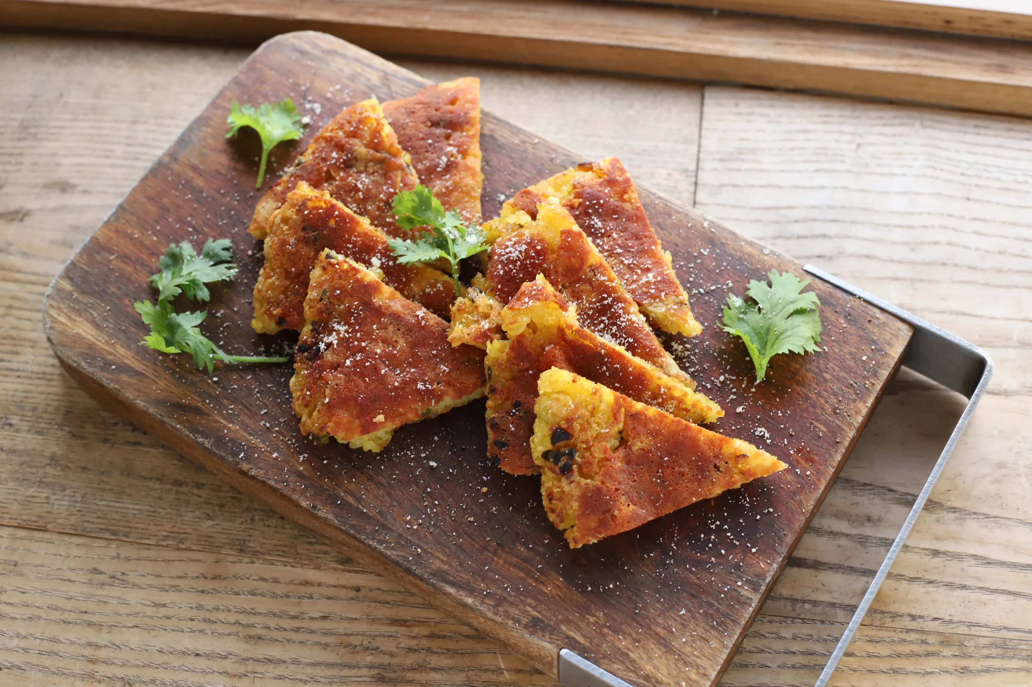 尾西のアルファ米「ドライカレー」をフライパンに薄く敷き、チーズを載せて焼き上げた一品。チーズを混ぜ込まず片面だけに載せるのがポイントでカリカリとした食感になり、スパイシーなドライカレーをより引き立たせます。味付け不要で、誰でも手軽に作れるだけでなく、お子様から大人の方まで楽しめる味わいです。