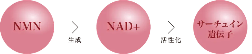 NMNは「ニコチンアミドモノヌクレオチド」の略称です。元々私たちの体内に存在する物質で、老化をコントロールし、細胞を若返らせる「サーチュイン遺伝子」を活性化させる物質NAD+を作り出します。