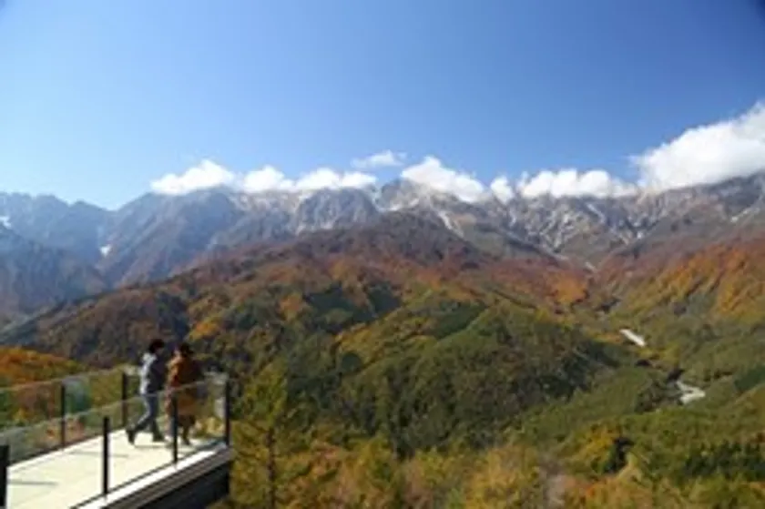 白馬岩岳マウンテンハーバーから眺めるアルプスからは山頂に降る初雪の「白」、中腹付近の紅葉する「赤」、山麓付近の色づく前の「緑」という三段紅葉を見ることができます。