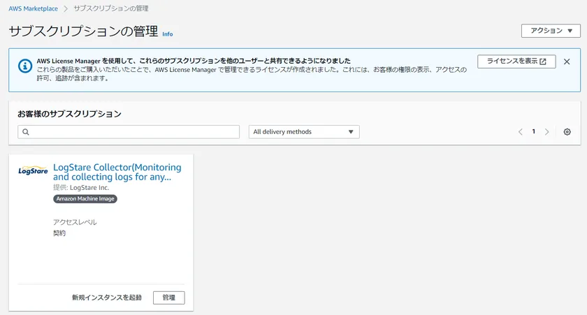 画像2:サブスクリプションの管理画面。この画面から新規インスタンスを起動し、いくつかの選択肢を選ぶだけでLogStare Collectorがインストールされたクラウドサーバーが完成する。