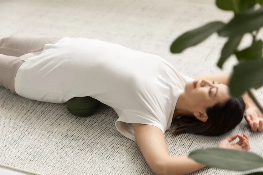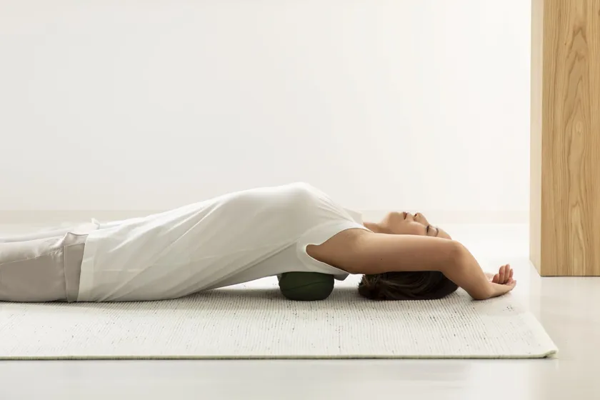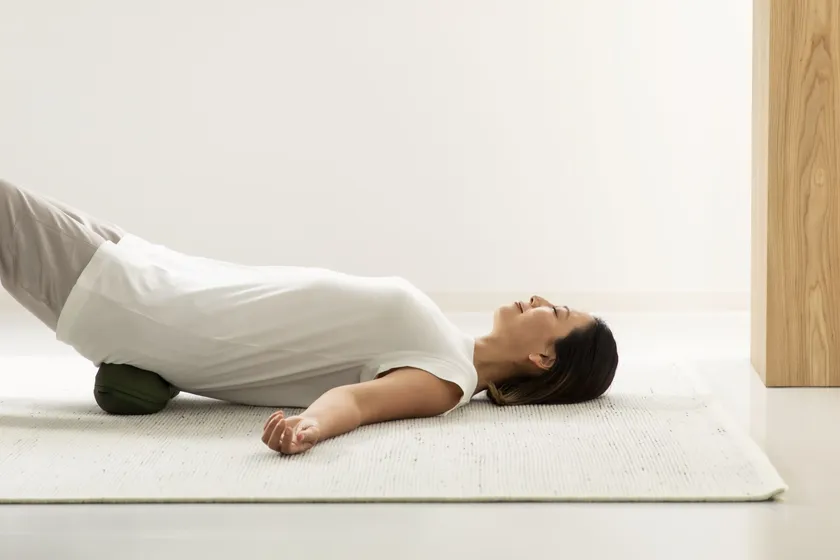 背中の下に置けば、背中をストレッチしながら肩甲骨まわりのコリをほぐせます。また、ひざを立ててお尻の下に置けば、骨盤まわり・お尻の筋肉を気持ちよく刺激しながらコリをほぐします。いずれも全身の力を抜いてリラックスして寝転がり、身体を左右に軽く揺らします。身体を動かすことで、押圧感が高まり、コリをほぐして血行を改善します。