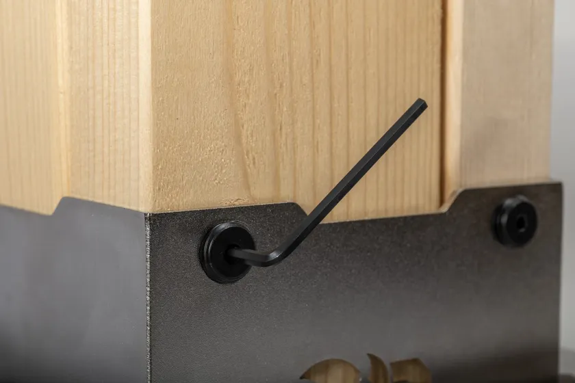 ・使い方は4本の「2×4材」を中空な四角煙突状に本体に差し込み、付属レンチで本体のボルトをねじ込むことで木材と本体と連結するだけ。