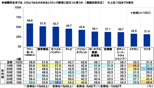 全回答者(1,000名)に、避難所生活では、どのようなものがあるとストレス解消に役立つと思うか聞いたところ、「フリーWi-Fi(公衆無線LAN)」(58.9%)が最も高くなり、次いで、「携帯電話」(51.6%)、「モバイルバッテリー」(50.7%)、「テレビ」(45.7%)、「パソコン・タブレット」(42.6%)となりました。避難所生活では、ストレス解消のために通信機器が欠かせないと感じる人が多いようです。