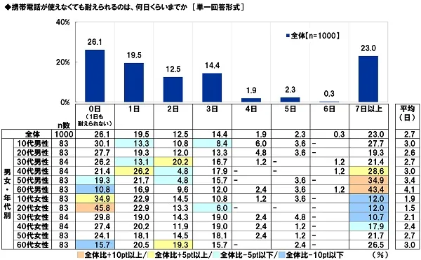 全回答者(1,000名)に、携帯電話が使えなくても耐えられるのは、何日くらいまでか聞いたところ、「0日(1日も耐えられない)」26.1%、「1日」19.5%、「2日」12.5%、「3日」14.4%となり、平均は2.7日でした。