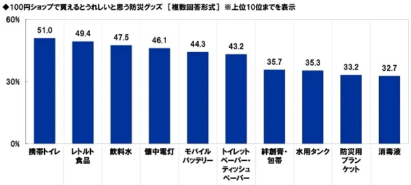 全回答者(1,000名)に、100円ショップで買えるとうれしいと思う防災グッズを聞いたところ、「携帯トイレ」(51.0%)が最も高くなり、次いで、「レトルト食品」(49.4%)、「飲料水」(47.5%)、「懐中電灯」(46.1%)、「モバイルバッテリー」(44.3%)となりました。停電時や避難所生活において役立つアイテムや非常食、生きていくうえで欠かせない飲み水などがTOP5となりました。そのほか、「トイレットペーパー・ティッシュペーパー」(43.2%)や「絆創膏・包帯」(35.7%)、「消毒液」(32.7%)といった衛生用品も上位に挙がりました。