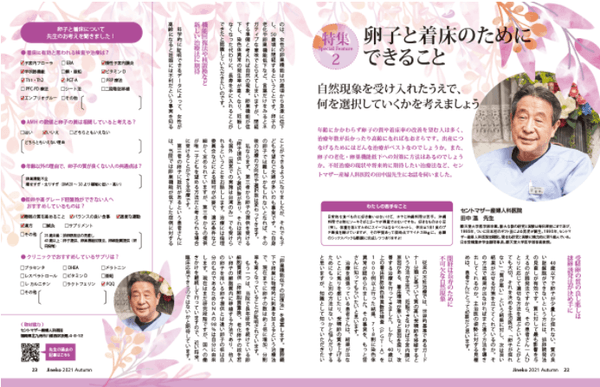 さらに、オンライン質問会開催レポート、不育症や着床不全の原因を調べるERA検査やPGT-Aについて、いつも参考になると声が高い皆さんから先生への相談「セカンドオピニオン」「40代の不妊治療」の他、Jineko Cooking (動画URLあり)、息抜きに夫婦で体験「森林セラピー」、などなど見どころ満載です!お見逃しなく!