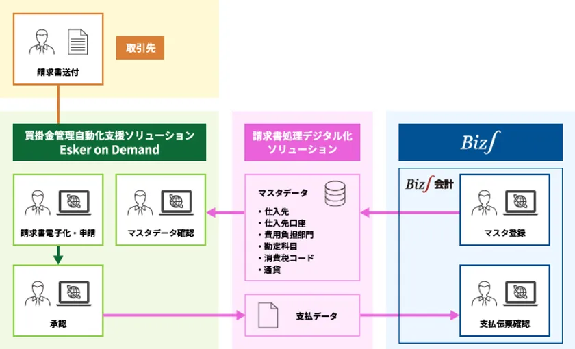 近年のテレワークをはじめとした経理部門の働き方改革やデジタル対応の必要性の高まりから、各種書類のペーパレス化は急務の課題となっています。特に請求書の電子化および支払伝票自動計上領域でのニーズが拡大しています。これらに対し、さくら情報システムが請求書の受け取りから電子化、仕訳計上までのプロセスをワンストップでできるソリューションを開発しました。本ソリューションにより、富士フイルムビジネスイノベーションが提供する「買掛金管理自動化支援ソリューション」で管理する支払データをNTTデータ・ビズインテグラルが提供するERP(統合基幹業務システム)Biz∫へ支払伝票として自動連携します。