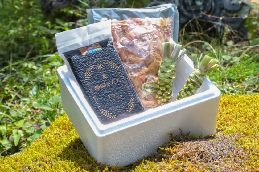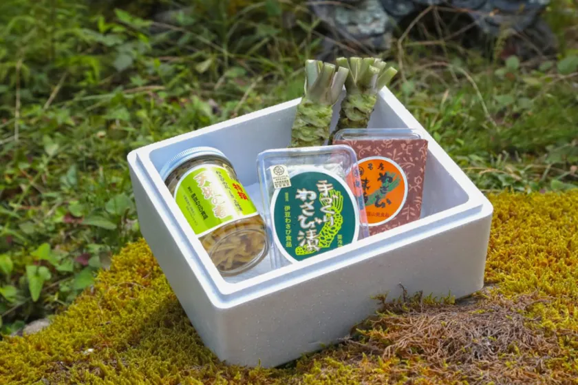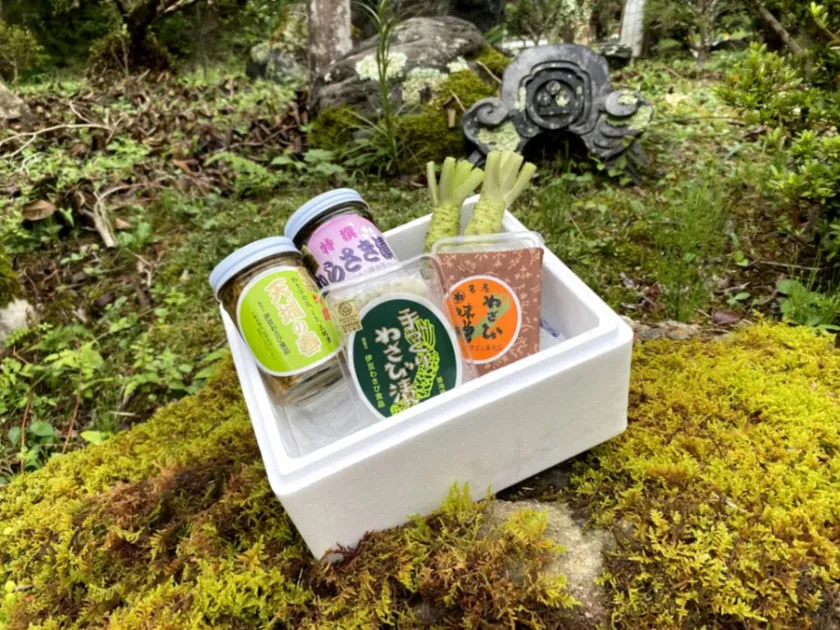 今回は生わさびだけでなく、手づくりわさび漬けやわさび味噌などの加工品も入ったセットをご用意いたしました。