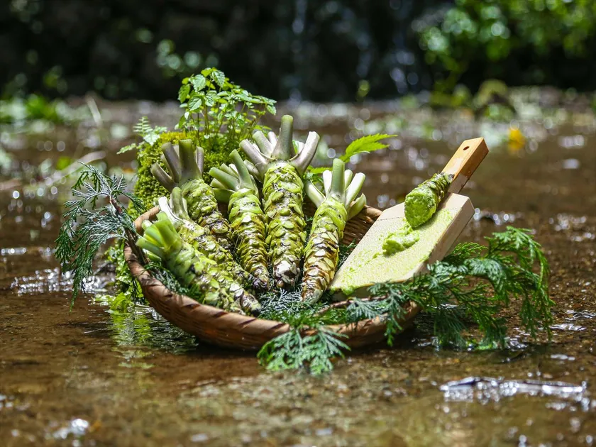 地表だけでなく岩盤からもあふれ出すミネラル豊富な天城山の湧水で香り豊かなわさびが育ち、そのわさび沢に合うように沢づくりを行うことで、太陽光を当て光合成と生長を促進させます。そして、わさび特有の辛さに加えて甘みも生まれます。