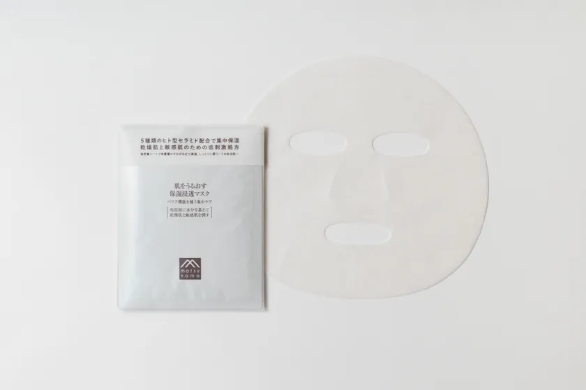 シートにたっぷり染み込んでいる化粧液には、保湿力があり浸透性に優れているヒト型セラミドを5種類配合。また、水分を抱え込んで膜をつくり、肌を保護するシロキクラゲ多糖体も含んでいます。敏感になっている肌に必要な水分を補い、保持する成分、さらに肌を保護する成分。「肌をうるおす保湿浸透マスク」は、これらを角質層にじっくりと浸透させ、しっとりと潤うハリのある肌へと整えます。