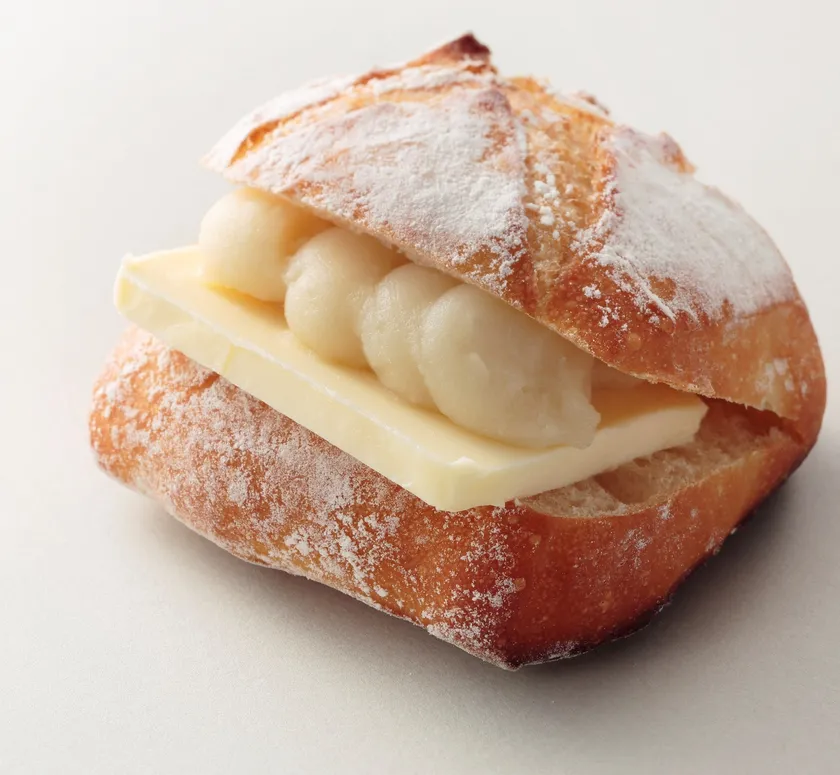 発酵バターとカマンベールチーズ餡が口の中でマリアージュする、とっておきの味わい。ホエイを仕込み水に使用してミルク感のあるパンをつくり、そして、発酵バターとカマンベールチーズ餡をはさんでいます。日本人になじみの高い「餡×バター」の組み合わせに、チーズの要素を加えたスペシャリテ。カマンベールチーズ餡も、「アトリエ・ド・フロマージュ」の手作りカマンベールを白あんに配合。バターは冷やしておいた方がくちどけがよいため、ご注文をいただいたのちに、発酵バターとカマンベールチーズ餡をはさんで、はさみたてにて提供いたします。