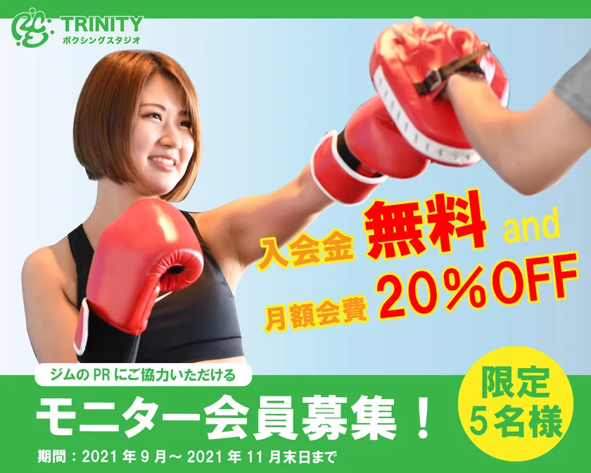 東京都千代田区にある少人数制ボクシングスタジオTRINITYでは、一緒にジムのPRにご協力いただけるモニター会員様限定5名を2021年9月1日から募集開始いたしました。