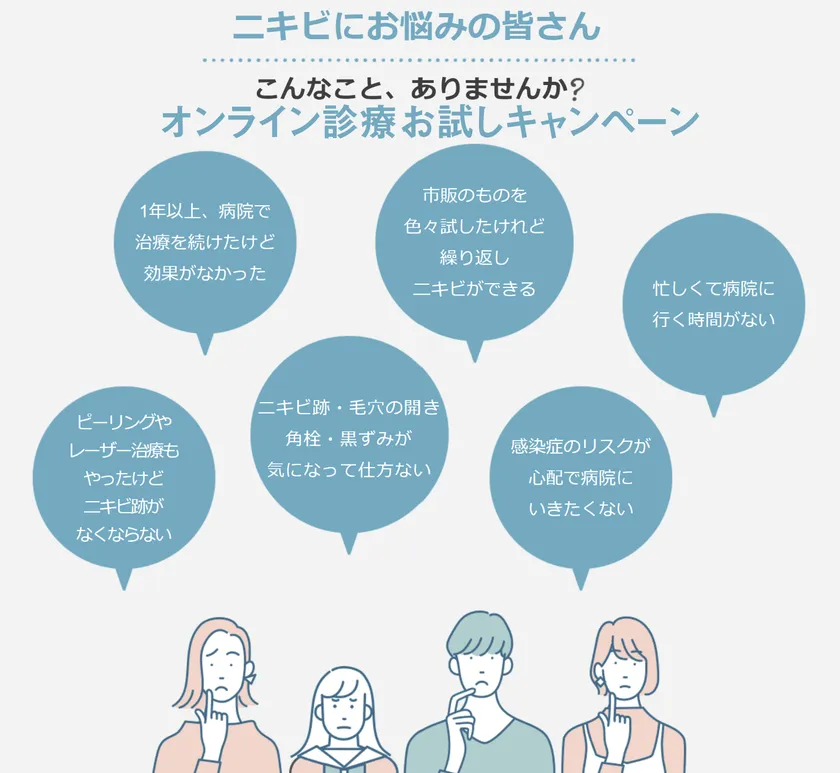 当院では本年2月より試験的にニキビ治療のオンライン診療を実施しておりましたが、この度、オンライン診療時間の拡大にともない、初めての方にも気軽に受診いただけるようにキャンペーンを設定しました。