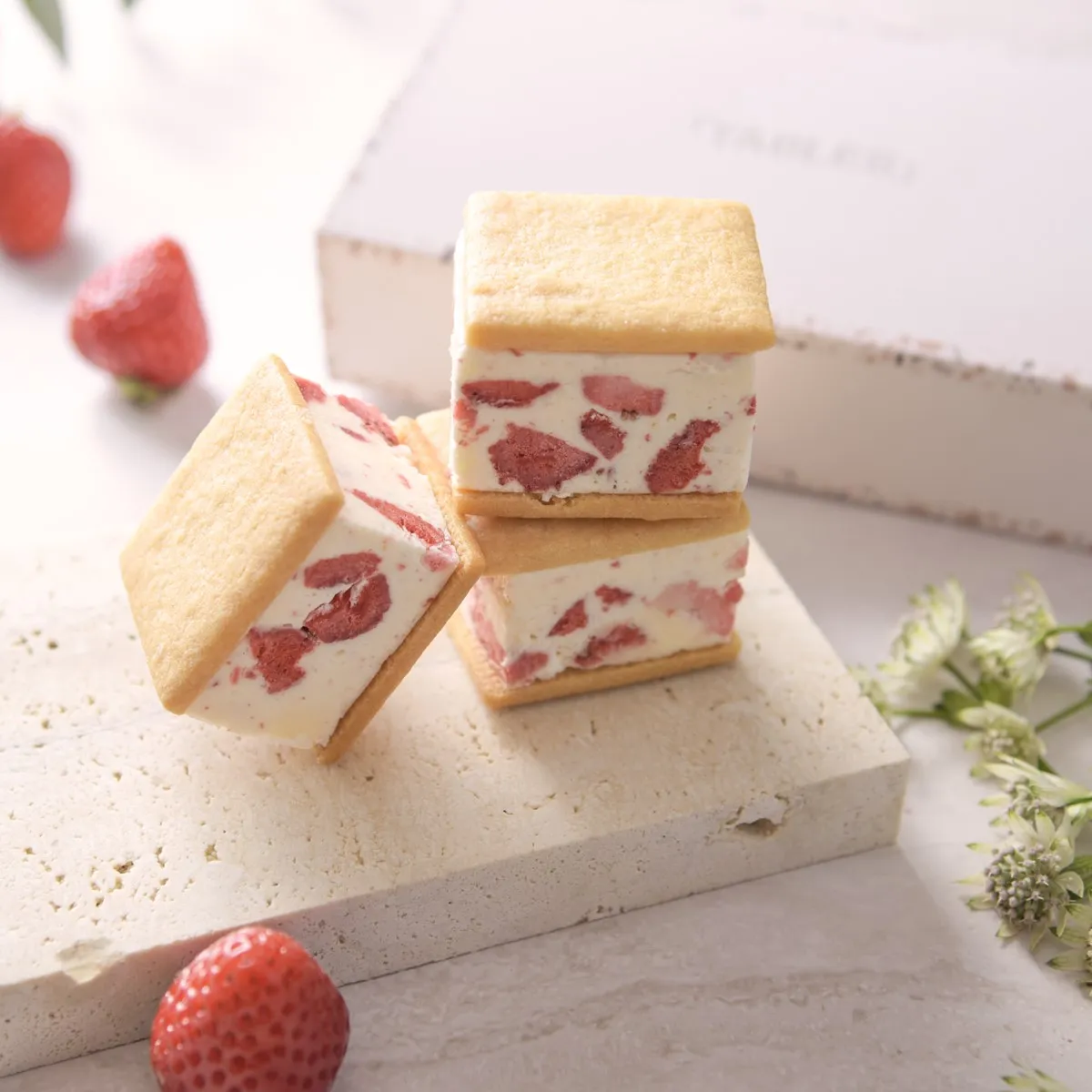 ホワイトチョコとバターを混ぜ合わせたくちどけの良いクリームを、サクサクのビスケット生地で挟んだバターサンド。約3cmもの分厚さでありながら、いくつでも食べられるようなふわりと軽い食感。フレーバーは、ラムシロップに漬けたレーズンがアクセントとなる上品な味わいの「レーズンバター」と、フリーズドライの甘酸っぱいイチゴを混ぜ込み、洋酒で香り付けした「イチゴミルク」の2種類。『婦人画報のお取り寄せ』では、人気ランキング第1位を独占し、売り切れが続くほど人気を博しています。上品なパッケージは、贈り物にも最適です。
