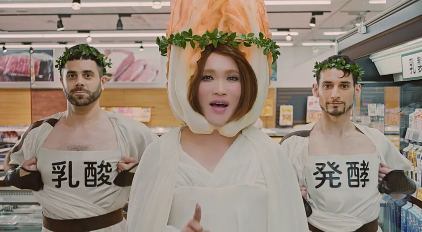 今回は、そんな“乳酸発酵している”「宗家キムチ」の良さを伝えるべく、IKKOさんにキムチの女神を演じていただきました。CMは、キムチの女神とその使いが、スーパーマーケットでお客さんや従業員の前に突如現れ、「宗家キムチ」をおススメするというストーリー。「発酵」と「IKKO」を間違えられたり、勝手に販売コーナーを設けてしまったりと、IKKOさんと登場人物たちが愉快なやりとりを繰り広げる、全3篇4パターンのCMとなっています。