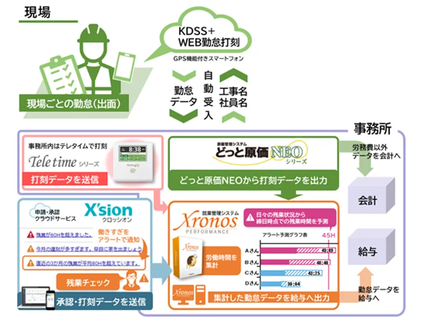 当社が提供するどっと原価NEOシリーズは「収益の早期把握や人的なミスの軽減」を実現してきましたが、今回の連携により、クロノスPerformanceが実現する「労働時間計算の人的ミスの軽減」はもちろんのこと、建設業における【出面・勤怠・原価管理】の一元管理をすることで、長時間労働者の把握・予測・注意を促しつつ、同時に原価管理も可能となりました。