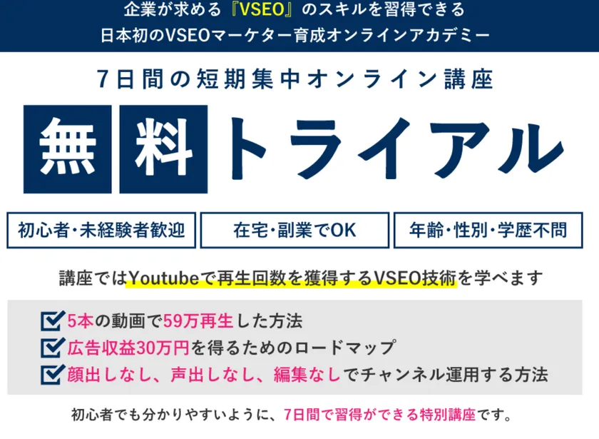 VSEOアカデミーとは、日本初となるVSEO(Video Search Engine Optimization)を学ぶことができるオンラインプラットフォームです。