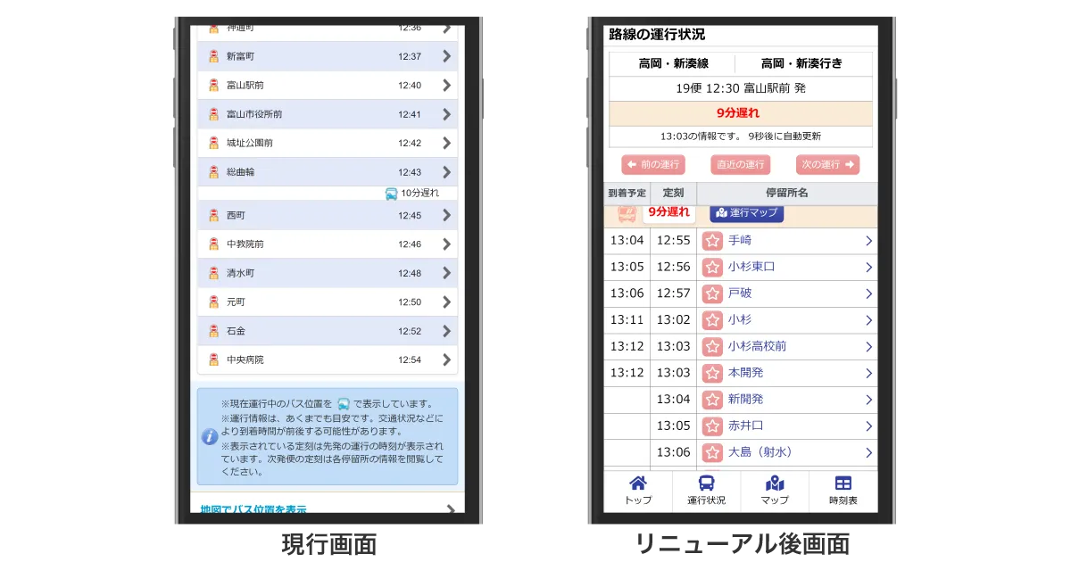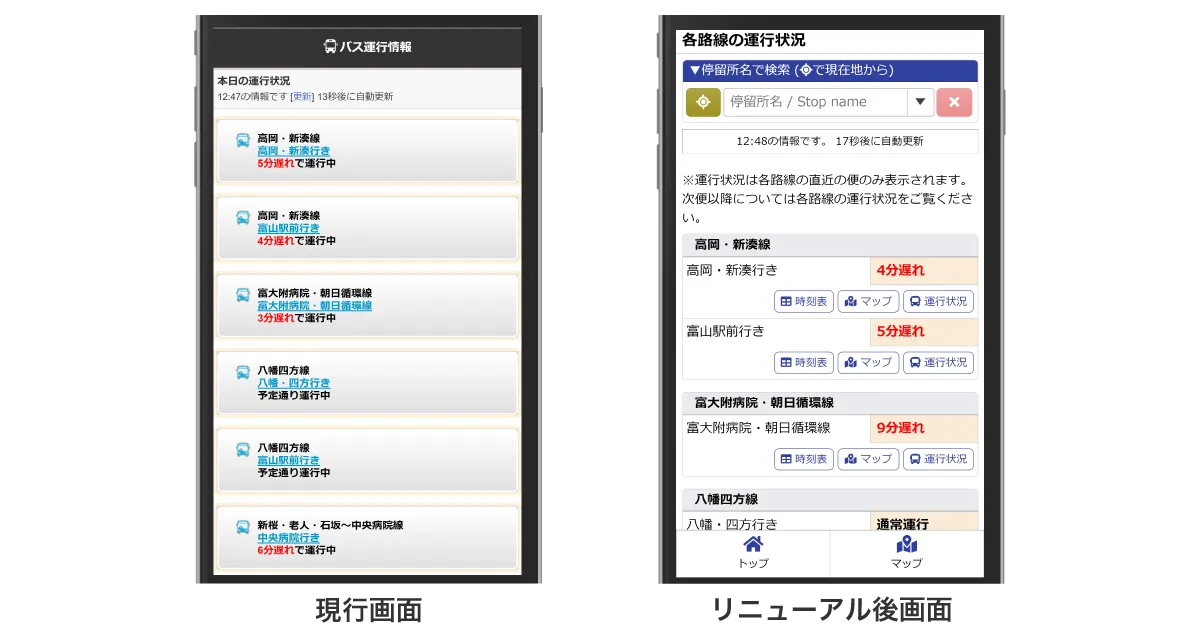 近年のスマートフォン利用ユーザーの増加をふまえ、運行マップにおけるバス位置の表現、時刻表表示機能の拡充、パーソナライズ機能(マイ停留所)の追加など、よりスマートフォンでの直観的な操作や画面の見やすさを意識したリニューアルを実施させて頂くことにより、多くのユーザーに実際に使用していただき、バスの利便性向上とバスを含めた公共交通の利用促進に努めてまいります。