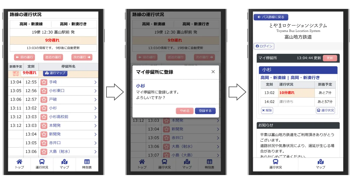 運行状況、運行マップ、時刻表表示、マイ停留所機能