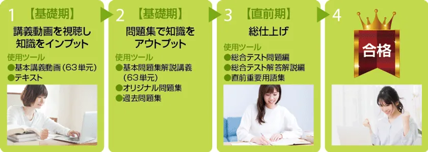 さらに、アウトプットの機会をたくさん取ってもらうために、過去問題集、総合テスト冊子もご用意。テキスト、講義動画、各問題集の連動効果で学習効率が飛躍的にアップします。
