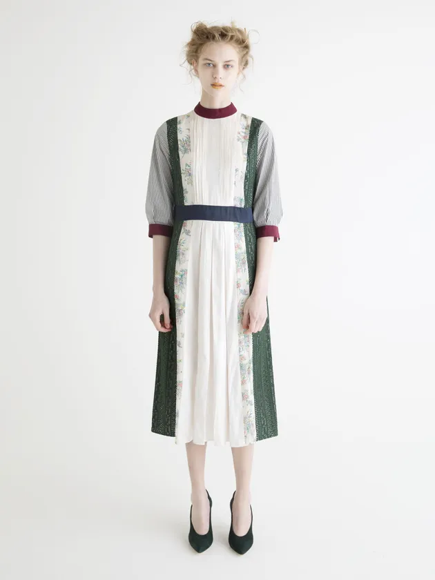 ブランドを代表するアイテムであるパッチワークワンピースは、1枚でスタイリングが完成し、ここぞというときに着ていきたい女性を輝かせるこだわりがつまった1枚。小花柄、レース、ストライプなどの生地を大胆に使用し、遊び心を散りばめたデザインは、襟元にビビットカラーを配したことで顔映りも良く、ゆったりした着用感ながら縦パネルのデザインでスラリとした印象です。