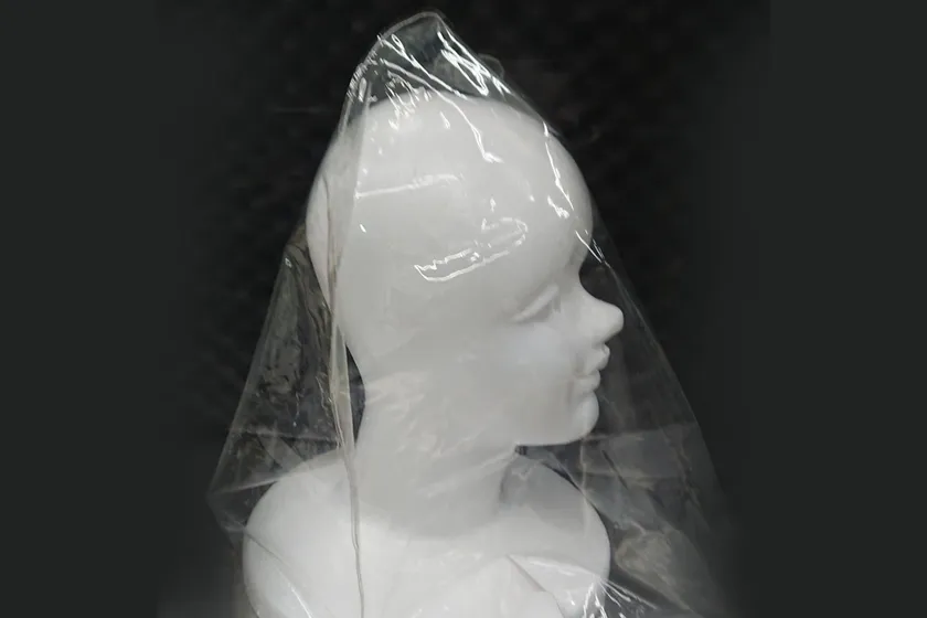 息苦しくないように鼻の位置に直径10cmの円の中に空気穴を数個開けてあります。