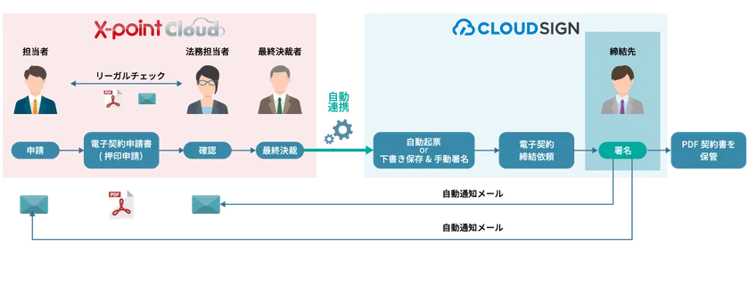 これにより、X-point Cloud で承認された文書が自動的にクラウドサインに連携し、電子署名や保管・管理ができ、クラウド上でシームレスな契約業務が行えます。