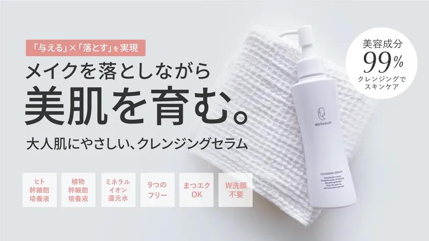 美肌研究家の白川みきが代表を務める株式会社ate(本社:名古屋市中区)が展開するコスメブランド“atebeaute(アテボーテ)”から、「美容成分99%。まるで美容液のようなクレンジングセラム」が登場します。2021年9月1日(水)より応援購入サイト「Makuake(マクアケ)」にて数量限定で先行販売をスタートします。