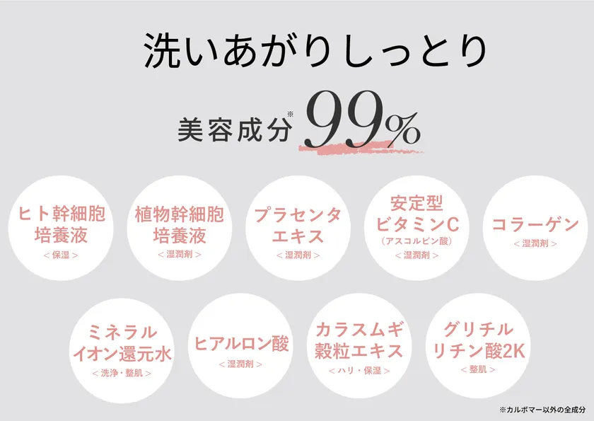 たっぷり99%の美容成分で、まるで美容液で洗っているかのような贅沢なしっとり感に。