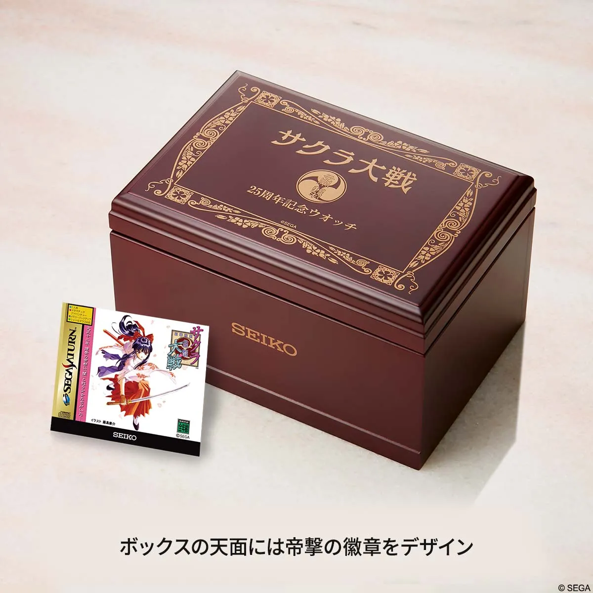 シリーズの代表曲「檄!帝国華撃団」のメロディを奏でる豪華オルゴールボックスに収めてお届けします。