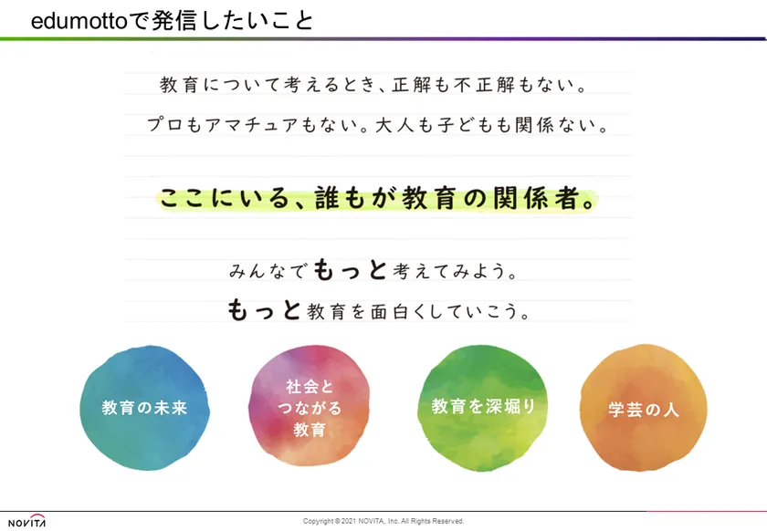 株式会社ノヴィータ(所在地:東京都新宿区、代表取締役社長:三好 怜子、以下 ノヴィータ、 https://www.novitanet.com/ )は、2021年8月25日付で創刊した国立大学法人 東京学芸大学の公式WEBメディア『edumotto』(エデュモット、以下:edumotto)の企画開発に携わり、今後運営を支援いたしますことをお知らせいたします。