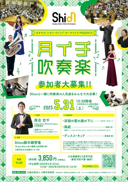 日本で最も長い歴史と伝統を誇る交響吹奏楽団のOsaka Shion Wind Orchestraを有する公益社団法人 大阪市音楽団(本社:大阪市住之江区/理事長:石井徹哉)は、月に一度、楽器を持っている方が集まって、Shionメンバーと一緒に吹奏楽曲を演奏できる人気イベント「月イチ吹奏楽」を2025年5月31日(土)に開催いたします。
