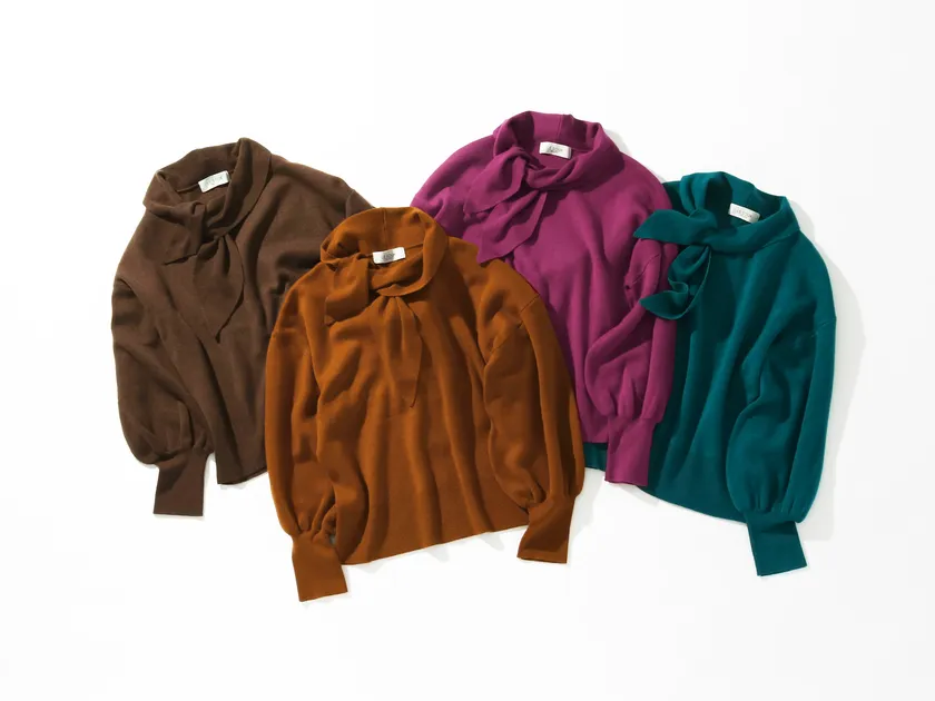 落ち着いた秋カラーながらも冨張さんらしい華やかで目を引く4色展開。1枚取り入れるだけで秋らしく主役になれるニットが作りたいという思いから誕生。トレンドの袖コンシャスを上品に取り入れ、首元のボウタイが女性らしいデザイン。袖を捲ると、丸みのあるボリューム袖を楽しむことができるようなシルエットになっている。肌触りの良いニット素材で初秋から冬まで長く使っていただけるような素材をセレクト。