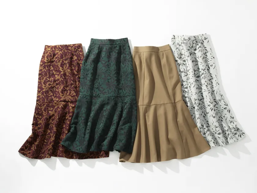 秋の本命スカートが欲しいと誕生したジャカードスカート。マーメイドシルエットで裾を切り替える事により、歩くたび揺れる動きが出るよう成形。穿いた時にスタイルが良く見えるよう、ウエストはすっきりとしながらも脚が長く見え、体のラインを綺麗に見せるシルエットにこだわった。1枚で華やかになるよう3色のジャカードと、様々な秋のアイテムと合わせやすい無地のベージュをセレクト。
