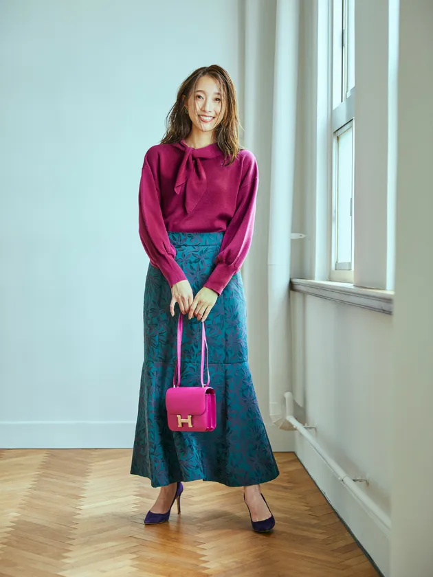 ボウタイ付きバルーンスリーブニット(オレンジ) 7,590円(税込)/マーメイドロングスカート(ワイン花柄) 8,690円(税込)