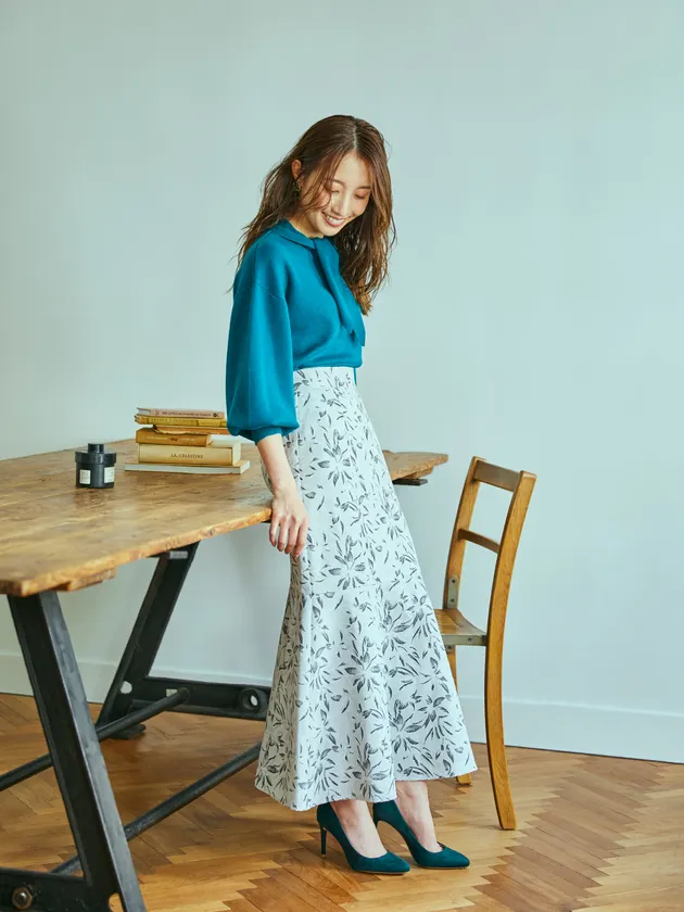ボウタイ付きバルーンスリーブニット(グリーン) 7,590円(税込)/マーメイドロングスカート(ライトグレー花柄) 8,690円(税込)