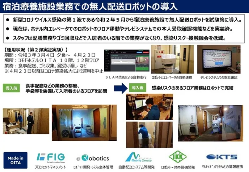 FIG株式会社(本社:大分市、代表取締役社長:村井 雄司)、FIGグループ4社(ciRobotics株式会社、モバイルクリエイト株式会社、株式会社石井工作研究所、株式会社ケイティーエス)、大分県(県知事:広瀬 勝貞)は、大分県の運営する宿泊療養施設において無人配送ロボットの開発及び導入に係る実証実験を行い、2021年3月4日から2021年4月23日の間、宿泊療養施設に入所する療養者への食事配送やゴミ回収の業務で運用し、運用実績を公開しました。