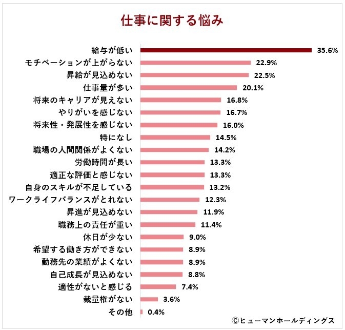 「仕事に関する悩み」(複数回答可)として最も多く挙げられたのは「給与が低い」(35.6%)でした。次いで「モチベーションが上がらない」(22.9%)、「昇給が見込めない」(22.5%)が挙げられています。