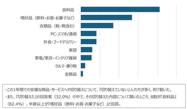 ■この1年間で、安価なブランドや商品等に切り替えをおこなったものは『食料品』が第1位