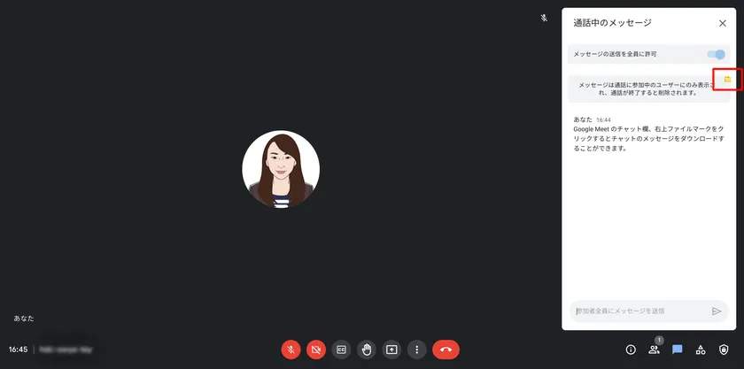 Google Meetのチャット欄、右上ファイルマークをクリックするとチャットのメッセージをダウンロードすることができます。
