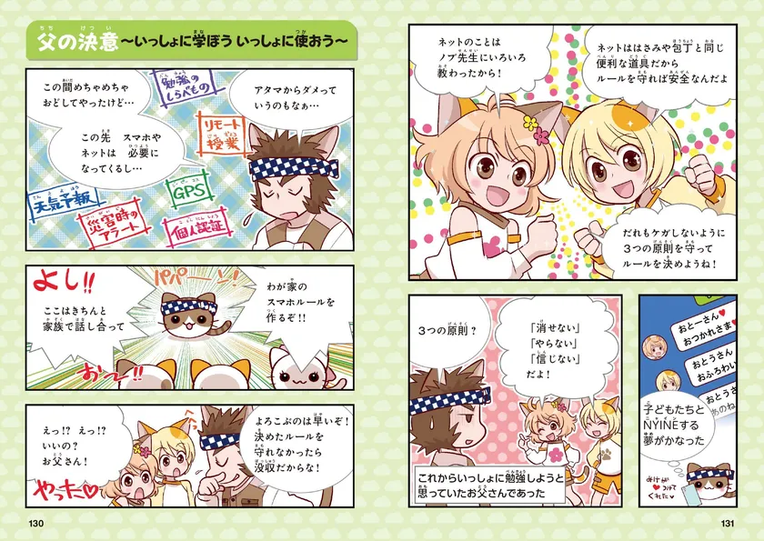 本書では、別に親向けのページを設け、親自身のリテラシー向上も目指しています。親に求められる対応や視点をレクチャーし、視点を同じくした上で、子どものインターネットの利用についてルールを一緒に作っていきます。