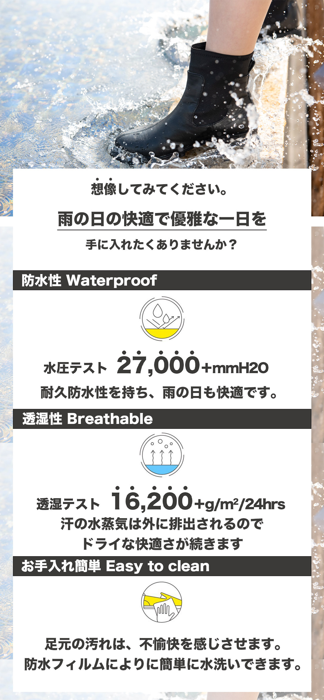 1. 完全防水で天気も気にせず、靴選びに困らない