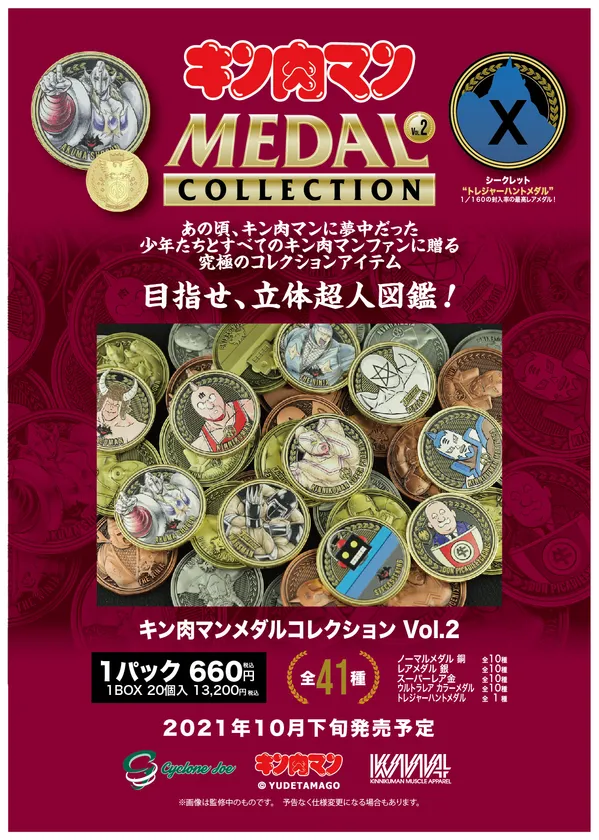 株式会社サイクロンジョーは、人気連載漫画『キン肉マン』をテーマに、美しい造形美と彩色にこだわった1個600円の低単価で気軽に低単価でで気軽にコレクションできるホビーアイテム『キン肉マンメダルコレクション VOL.2』を、2021年11月下旬より全国KIN29SHOP各店、各店頭及びネット販売にて発売いたします。