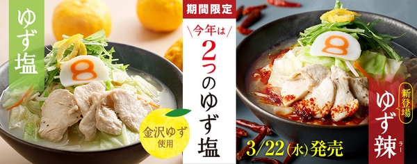 株式会社ハチバン(本社:石川県金沢市、代表取締役社長: 長丸 昌功)が展開するらーめんチェーン「8番らーめん」では、春限定の人気メニュー「野菜ゆず塩らーめん」を2023年3月22日(水)より期間限定で全国の8番らーめん店舗で販売いたします。さらに今年は、香る辛さがおいしい新商品「野菜ゆず辣らーめん」もラインアップいたします。「野菜ゆず塩らーめん」は、5年目を迎えた人気メニューです。昨年からブランド柚子「金沢ゆず」を使用しており、芳醇な香りと、やさしい酸味のスープが特徴です。最後の1滴まで飲み干したくなる、後味さっぱりでクセになる味わいです。昨年は、1ヶ月の販売予定でしたが、約2週間で完売するほどご好評をいただきました。全国の8番らーめんで金沢ブランドの魅力を発信し、地域活性化への貢献を目指します。