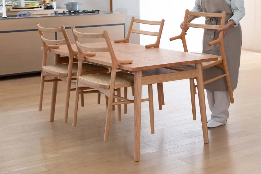 暮らしは時代とともに変化していきます。新しく便利な家電が増え、暮らし方の価値観まで変わる今、家具はそのままで良いのでしょうか。例えば、今や多くの家庭で使われるようになった全自動ロボット掃除機は、床にモノを置かない方が効率的に使用できます。そのためにアームを引っ掛けてほんの少し脚を浮かせられるダイニングチェアは、べんりにくらすための家具のひとつのかたちと言えるかも知れません。